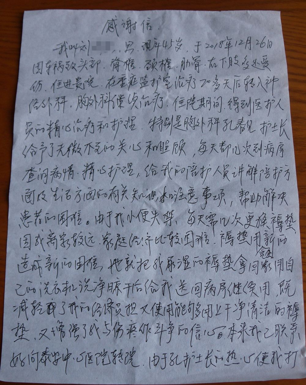 患者因车祸导致头部,脊椎、颈椎、肋骨、右下肢等多处外伤,入住我院重症医学科、神经外科、胸泌尿外科等科室治疗,住院期间受到我院医护人员的爱心服务,特别是胸泌尿外科孔春建护士长对其无微不至的关心照顾,无私为其清洗褥垫,解决其离家远、经济负担重等困难,打消患者转院治疗的想法,增强战胜疾病的信心;神经外科董燕护士长在其专科后依然为其提供理发工具,肥城矿业中心医院医护人员对患者真心帮助切实为患者解决困难,爱心耐心服务感动患者,患者特送感谢信表达感激之情!
