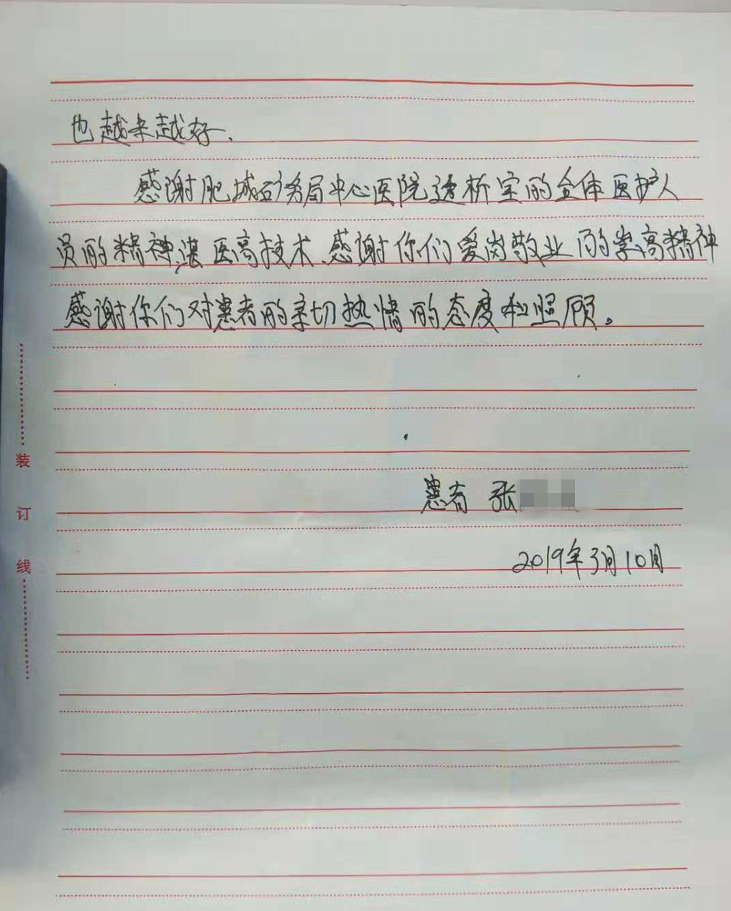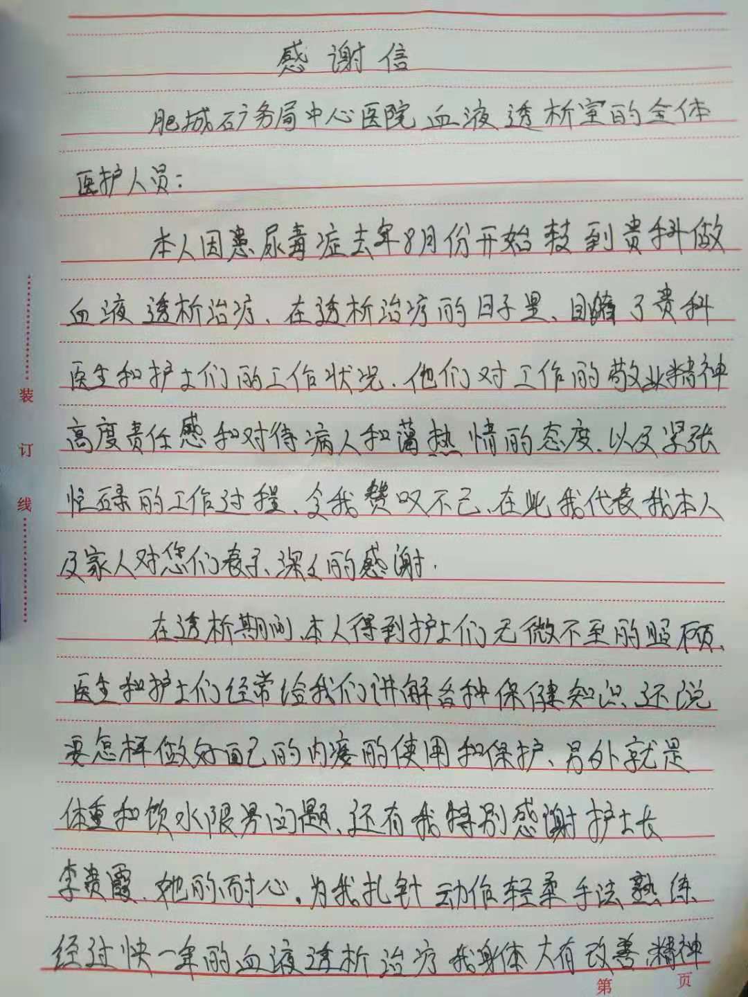 近日肥城矿业中心医院收到患者表扬信,信中诚挚感谢血液透析室医护人员的优质服务。患者因尿毒症长期在肥城矿业中心医院血液透析室进行透析治疗,在此期间患者感受到透析室医护人员对工作的敬业精神和高度责任感,感受到对病人的耐心细致指导和热情温暖服务,特别是李桂霞护士长娴熟轻柔的技术令人折服!在其漫漫透析路上,感谢中心医院血液透析室医务人员的关爱与陪伴!
