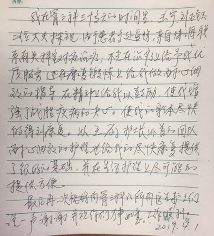 近日我院骨三科医务人员以其精湛的医术,高尚的医德,耐心细致的服务赢得患者的赞誉。患者因车祸伤入住我院3个多月,在骨三科治疗一月余。在骨三科治疗期间医务人员像亲人般温暖服务赢得了患者信赖。也别是王宁、刘正钰两位医师不仅医术高,而且在康复中给予科学指导,两位医师的关爱极大地鼓舞了患者战胜疾病的勇气,以王丽为首的护理人员在生活上给予多方照顾,像亲人一样令人感动。近日患者痊愈出院,特写感谢信表达深深的谢意!
