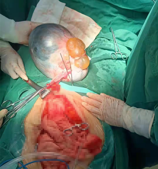 该患者为72岁老年女性,因阵发性下腹痛伴腹胀2个月到肥城医院妇科就诊,入院后完善相关检查,化验肿瘤标志物CA125  335.6u/ml,彩超提示腹腔内巨大囊实性包块20*12cm,盆腔磁共振提示腹腔内巨大囊实性病灶,考虑右附件占位,肝脏前、下缘,膈下及网膜多发结节,考虑晚期卵巢癌,病人病情较复杂。妇科团队经与普外科、胸外科、麻醉科、影像科、肿瘤科多学科会诊,细致讨论患者病情,制定了周密治疗计划,完善术前准备,于2021-09-10在全身麻醉下联合普外科行卵巢肿瘤细胞减灭术+膈肌下转移病灶切除术+肝表面转移肿瘤切除术,手术历时五个多小时,为患者成功切除了巨大的卵巢恶性肿瘤,达到预期效果,患者术后恢复良好。标志着我院卵巢肿瘤根治手术水平再攀高峰。