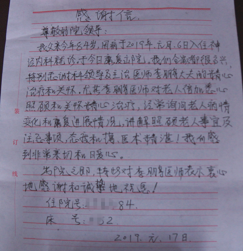 近日肥城矿业中心医院李鹏医师以其精湛的医术,高尚的医德获得患者家属的信赖和感谢!李鹏医师在诊治过程中踏实细致的践行医者仁心、大医精诚的为医之道,精心治疗,真诚关心,80多岁的老人康复出院,患者家属非常感动,赠送表扬信表达谢意!