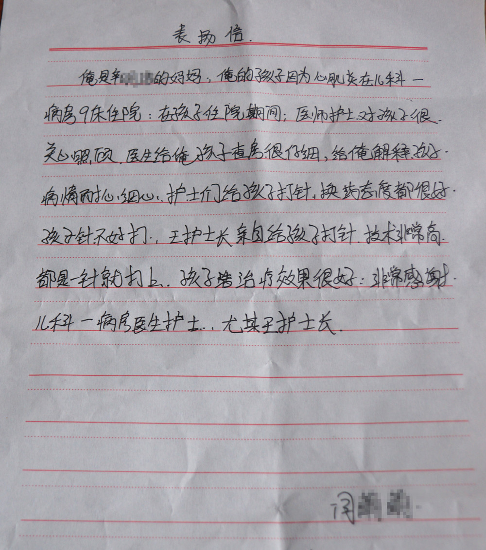 儿科一病区一位患儿妈妈表扬信里诉真情