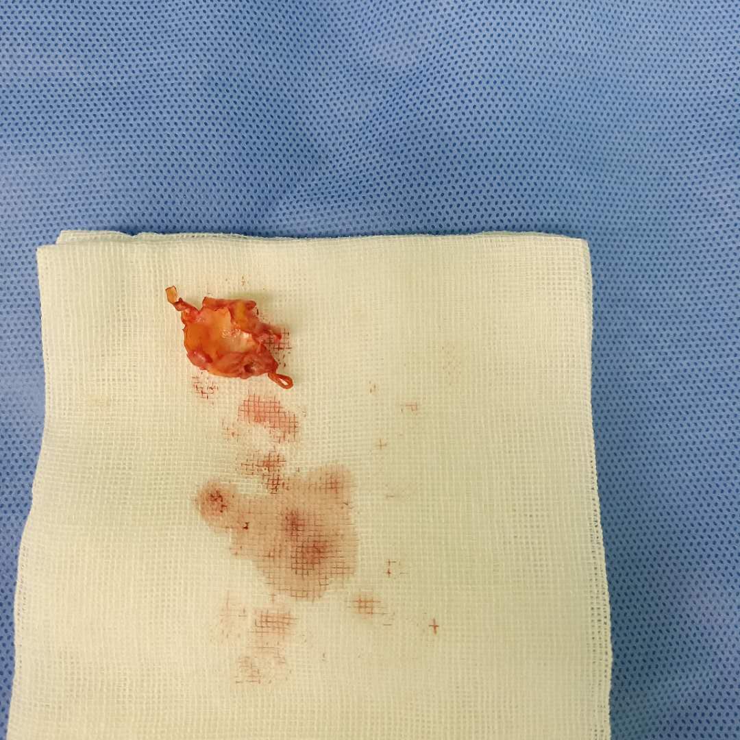 病历四,64岁,男性,言语不清及左侧肢体无力10小时入院。颈部血管彩超检查是右侧颈动脉起始部狭窄90%以上。入院后完善相关检查。行颈动脉内膜剥脱术。术中发现颈内动脉起始部钙化性斑块会形成,基本将管腔堵塞。手术后患者恢复良好。