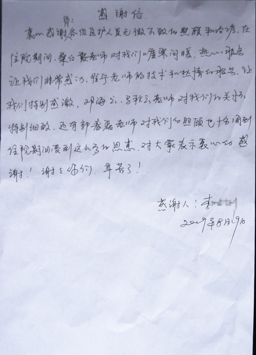 近日肥城矿业中心医院骨二科团队收到患者表扬信赞扬,特别是桑红霞、崔宁、邓海云、马秋云、郭春磊等护理团队优质的护理技术和温馨服务令患者非常感动,特赠送感谢信表达谢意!
