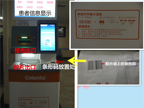 为方便广大患者拿取影像报告和胶片,缩短就诊等待时间,肥城矿业中心医院影像科新上胶片、报告自动打印系统,现已顺利使用了。患者在放射科就诊时,医务人员会给患者一个胶片袋,袋子上贴有一个条形码,这就是取片所需要的。把这个条形码朝上放到机器上对应位置扫描,即可打印,如果不显示说明医生还未完成报告,请耐心等待。