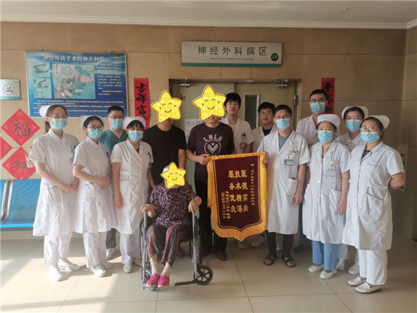 患者高某,老年女性,脑出血,2020624日发病,至省级医院检查提示脑出血合并硬膜下血肿,省级医院下达病危医嘱,预计预后极差,生存周期不足一周。患者家属遂转至我院神经外科治疗,范永建主任及主管医师董方亮对患者情况进行详细评估,考虑可行开颅手术清除血肿,患者家属担心术后患者生活质量不高,拒绝手术。后患者病情进一步发展,出现慢性脑疝,意识进行性变差,主管医生再次同患者家属沟通,强烈建议行钻颅引流术解除硬膜下血肿压迫,经患者家属签字同意后,行手术治疗。术后神经外科医护团队精心治疗,细致观察病情,耐心护理指导,经过精心治疗护理后,患者脑疝解除,精神好转,拔管后患者可下地活动。患者及家属对我院医疗水平及服务态度高度认可,特赠送“医德高尚 技术精湛 服务优良”锦旗,表达对神经外科全体医护人员的感谢。