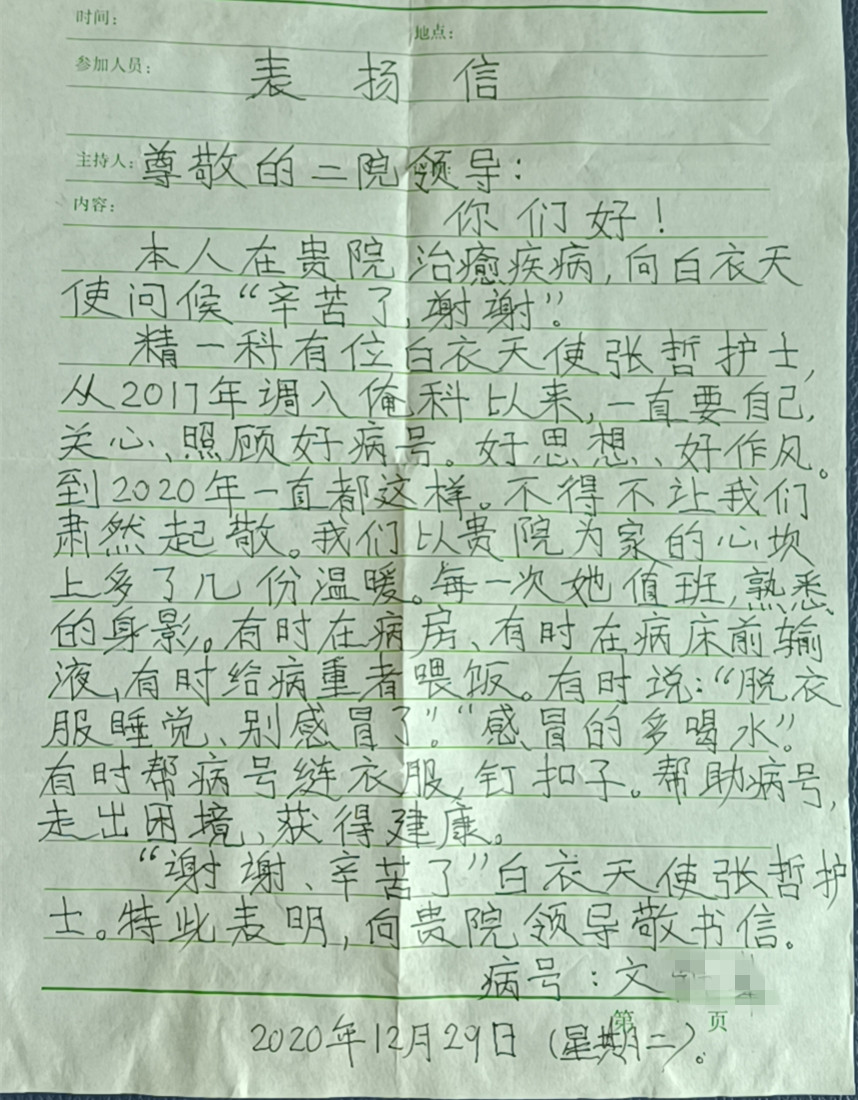 近日医院收到一位精神病患者的表扬信,信中诚挚感谢精神科张哲护士几年来在工作中以细致入微的关爱温暖精神病人缺失的心灵,帮助他们走出困境,获得康复,时时感受到医院大家庭的温暖关爱!