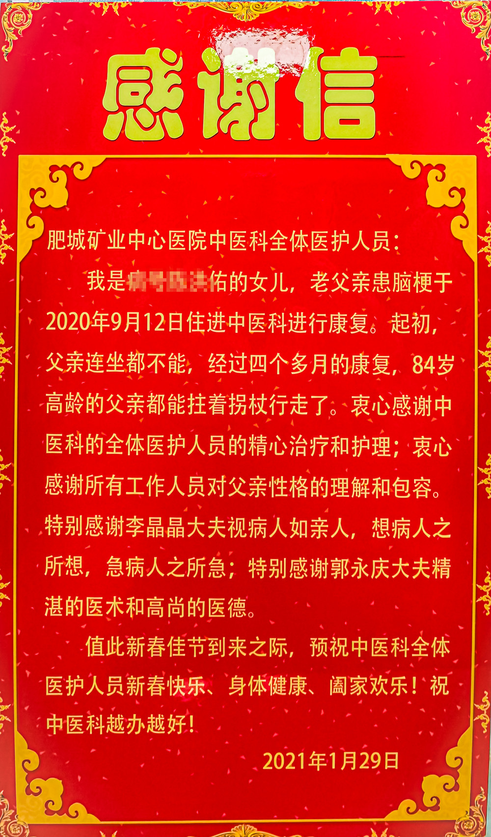 近日我院中医科医护团队收到患者家属赠送的感谢信,感谢中科医护人员精心康复治疗,帮助老父亲实现再立行走,极大地改善了老人生活质量。