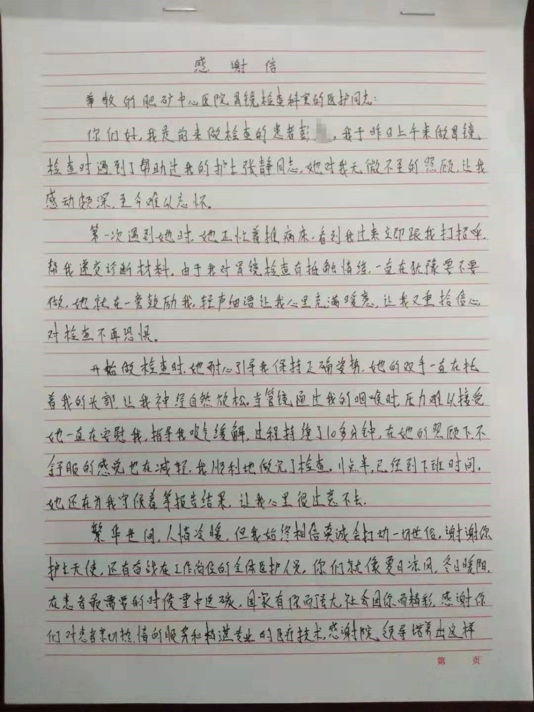 近日,我院胃镜室张静同志获得患者感谢并表扬。“轻声细语让我心里充满暖意,重拾信心”。这句话便是该患者表达感谢时吐露的心声。