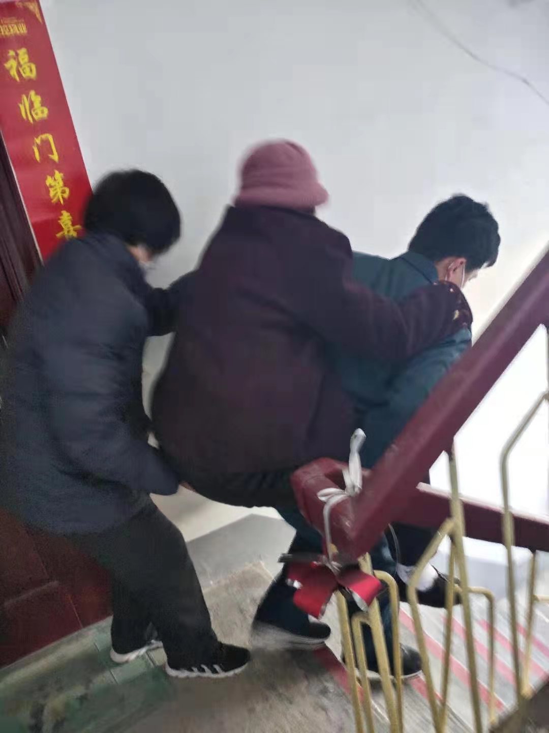 2月16日(正月初五)下午,某社区居户呼救,家里有90多岁的老人身体不适。我院120迅速出诊,到达现场后,发现家中只有患者和其女儿,周围实在找不到其他人帮忙把老人抬下楼来。面对此情此景,急诊科张超超毫不犹豫,毅然一个人将老人从楼上背了下来,即使是年轻力壮,也是压弯了腰,患者家属感动不已。