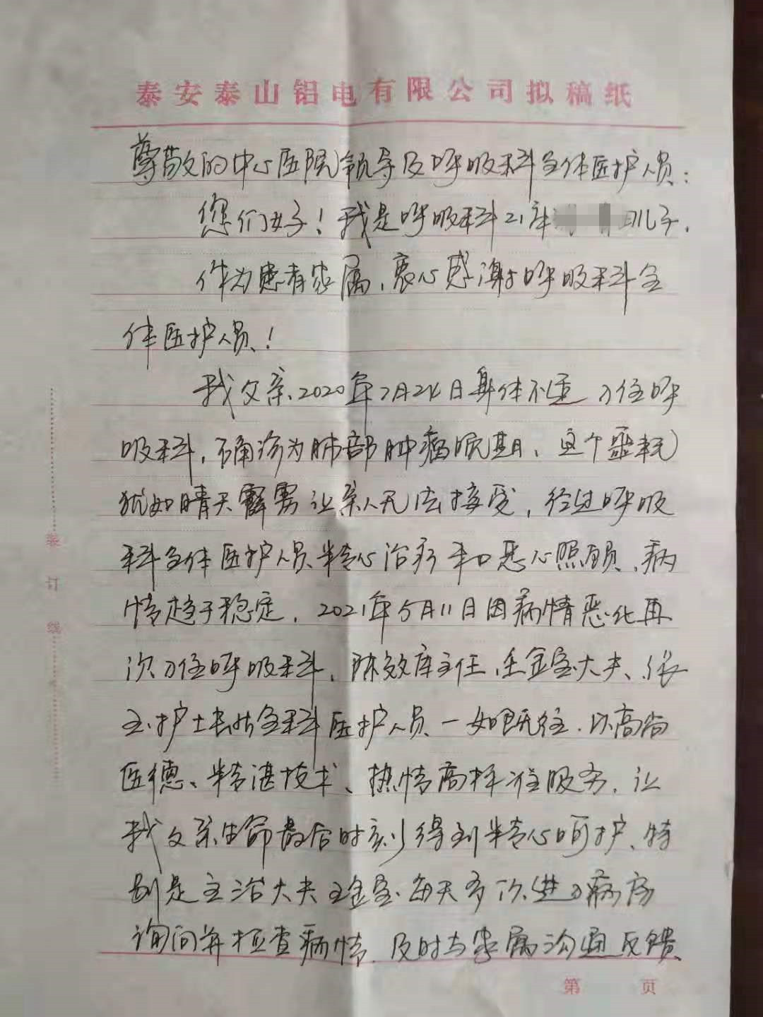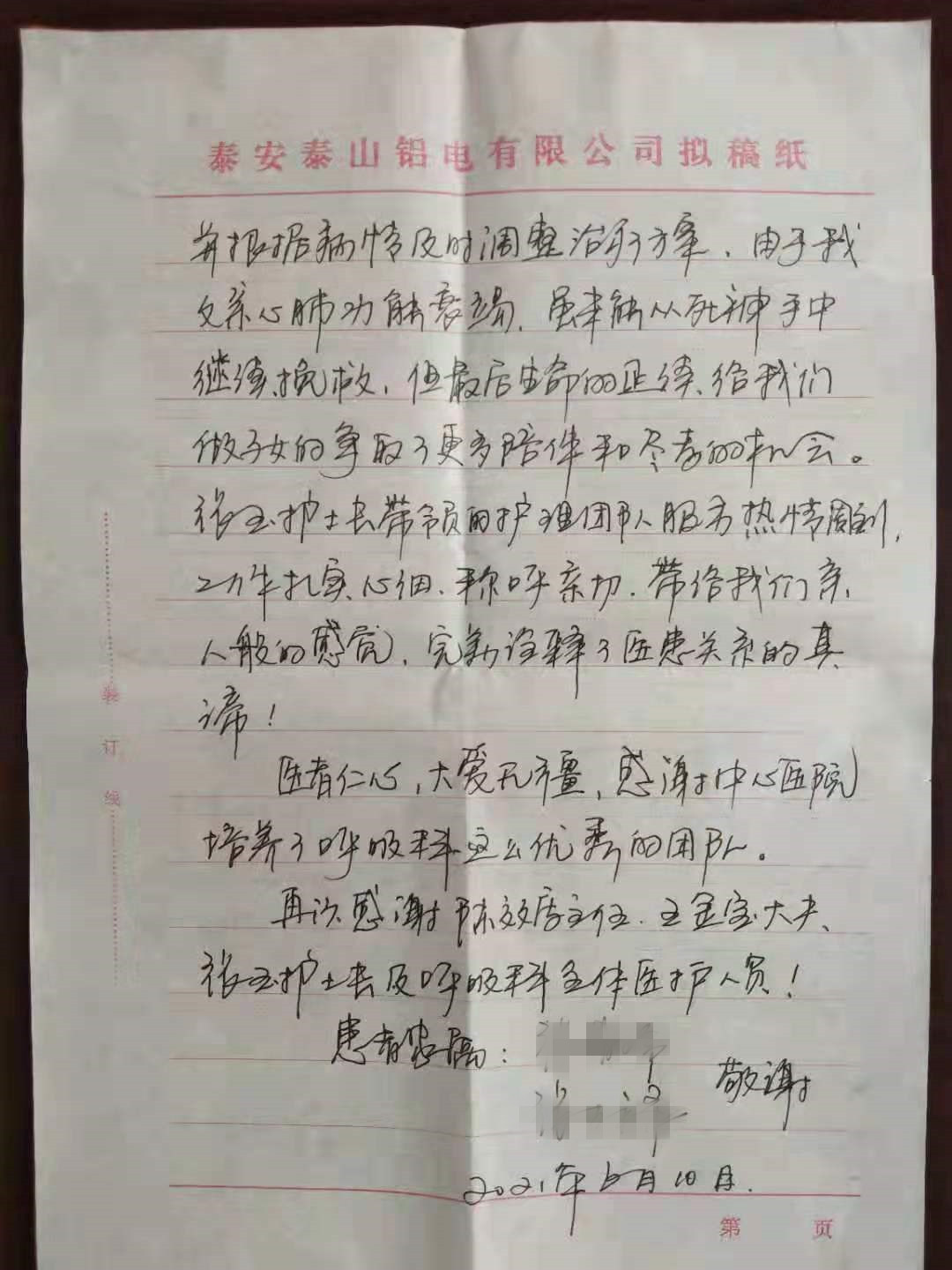该患者为恶性肿瘤患者,两次入住呼吸内科,最后一次因心肺功能衰竭未能挽留患者生命。尽管如此,患者家属还是被呼吸内科医护人员亲人般的照护关爱所感动,特写感谢信,感谢对老人的温暖呵护,让老人在爱中辞世。